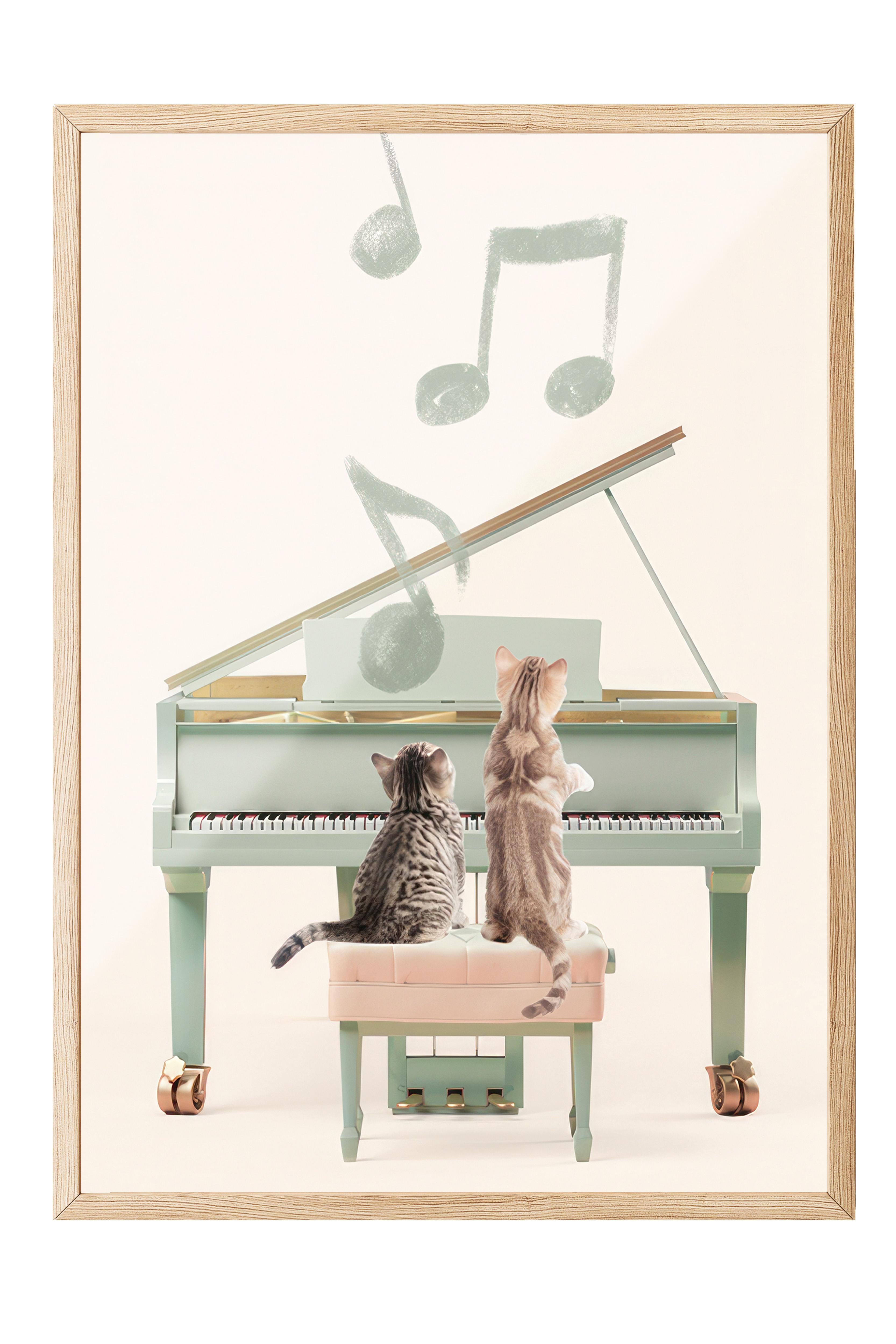 Cats Playing Piano Çerçeveli Tablo, Ahşap Çerçeve ve Poster, Duvar Tablosu Comfort Serisi NO:108440